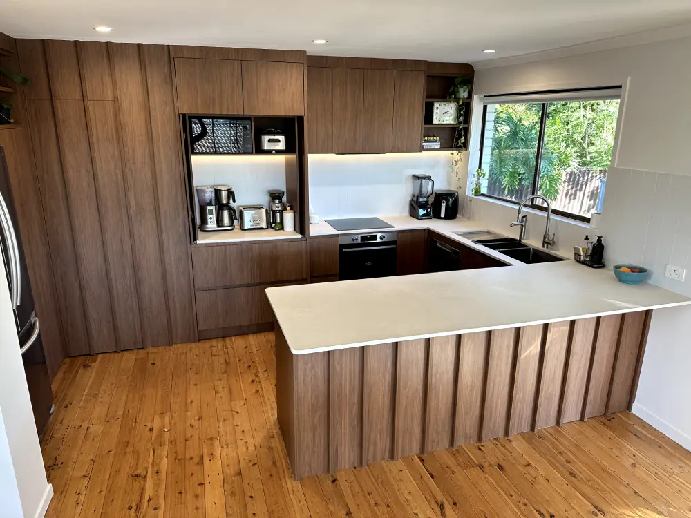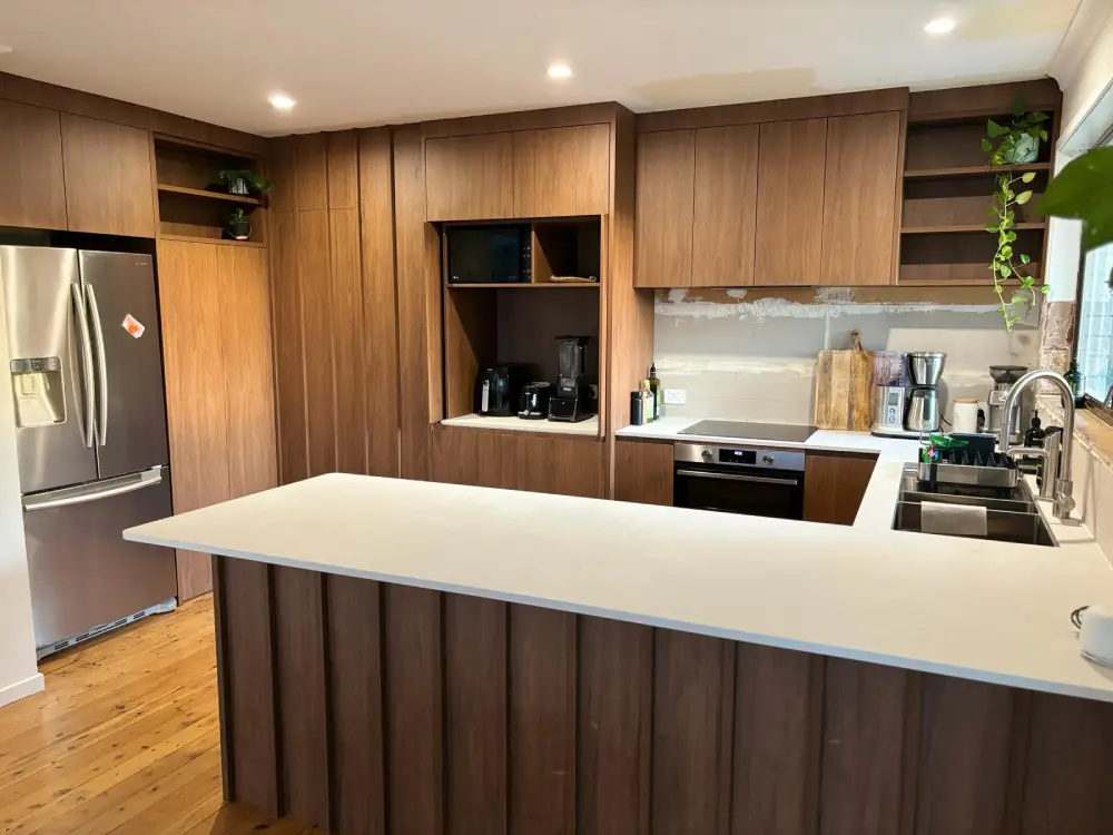 This kitchen renovation in Palm Beach was a joy to undertake, combining our expertise with the client’s creative input to breathe new life into a dated space. The result? A contemporary and elegant kitchen in a stunning Florentine Walnut finish.